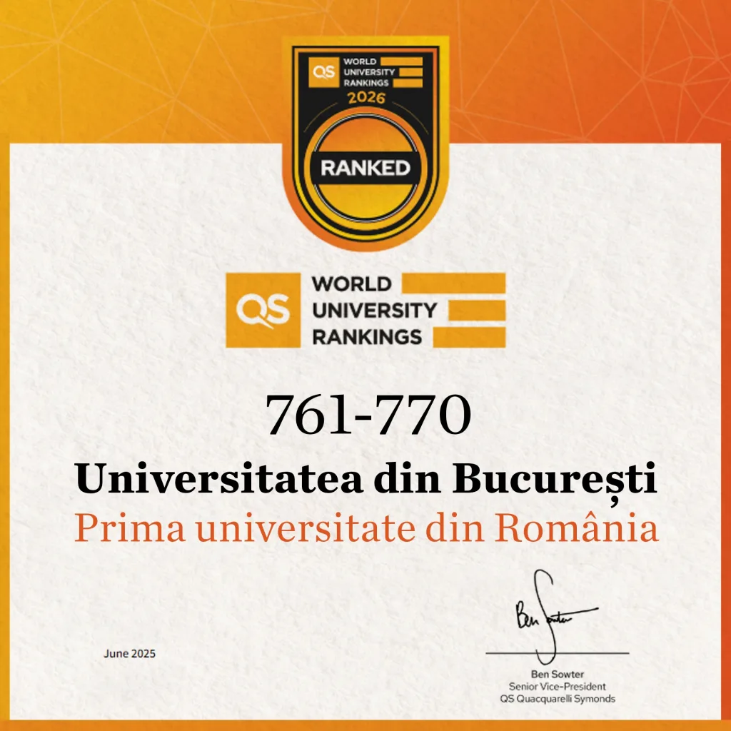 Universitatea din București își reconfirmă poziția de lider – PDF al învățământului superior românesc, conform celei mai recente ediții a clasamentului QS World University Rankings 2026 – PDF, dată publicității astăzi, 19 iunie 2025. La nivel mondial, Universitatea din București se clasează în intervalul 761 – 770, marcând o evoluție semnificativă față de ediția precedentă (801–850) și obținând unele dintre cele mai bune rezultate din ultimul deceniu.